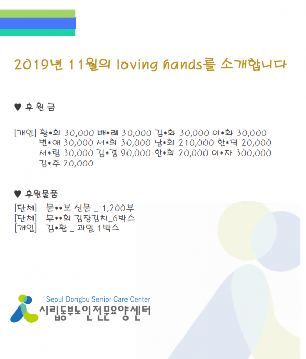 2019년 11월 loving hands!!를 소개합니다. 페이지 정보 작성자 최고관리자 작성일2019-12-05 10:00 조회13,816회 댓글0건 관련링크 이전글 다음글 목록 본문 어느덧 한 해의 끝자락, 12월이 되었습니다. 한 해 마무리 잘 하시고 모두 행복하세요~12월에도 많은 관심과 사랑을 부탁 드립니다. 댓글목록 등록된 댓글이 없습니다. 이전글 다음글 목록